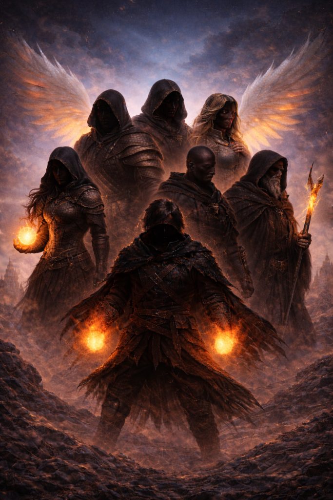 As a reluctant leader, Jovias bears the burden of command as a perpetual wound. He values order, restraint, and compassion, even when such compassion comes at a high price. Surrounding him are the Seven, all uniquely broken and formidable: Kyros, the storm-blooded berserker who mocks fate; Ioel, the silent assassin devoid of hatred; Angelica, a radiant healer whose unwavering faith surpasses her physical limits; Galal, a bearer of truth whose words sting deeper than blades; Anani, the archer who finds mercy where others see weakness; and Auriel, a judge haunted by the consequences of justice.